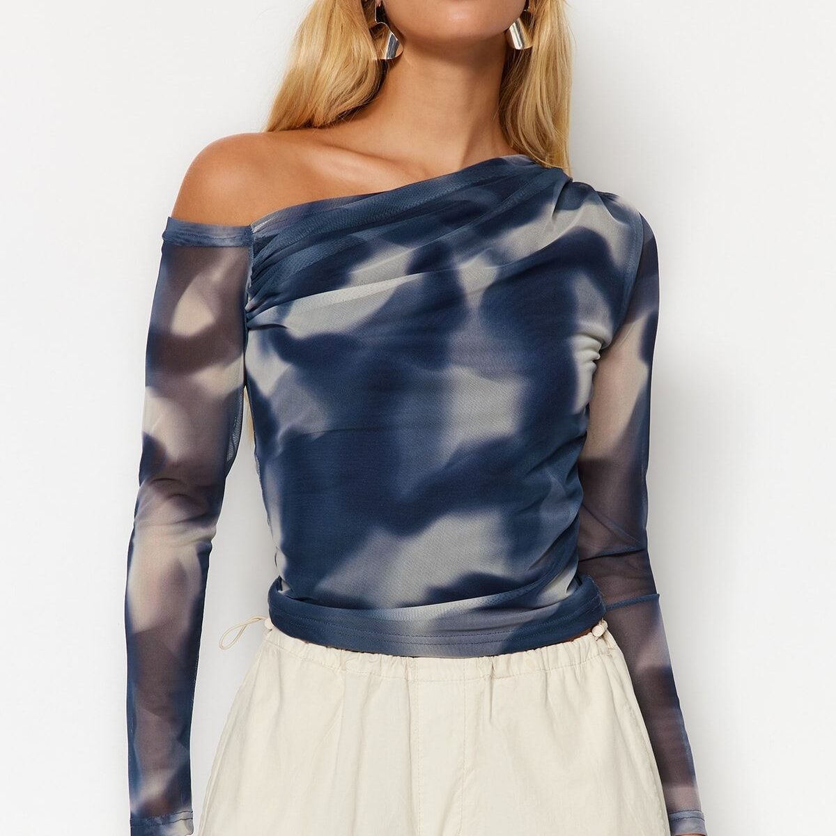Petrol Tül Astarlı Asimetrik Yaka Örme Bluz